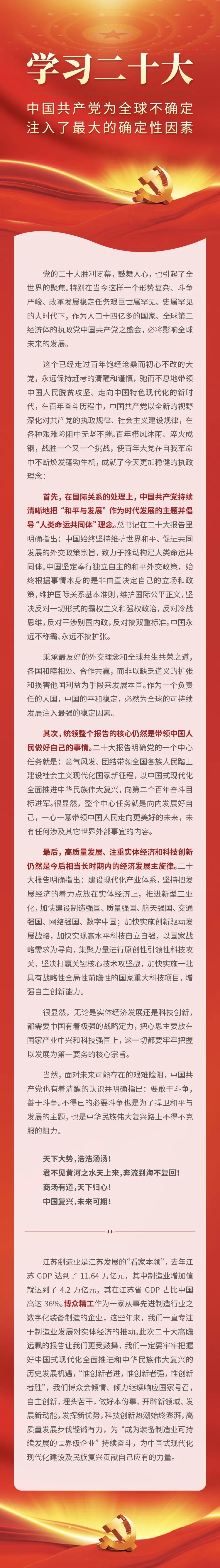 江苏制造业是江苏发展的“看家本领”,去年江苏GDP达到了11.64万亿元,其中制造业增加值就达到了4.2万亿元,其在江苏省GDP占比中国高达36%。博众精工作为一家从事先进制造行业之数字化中超官方网站制造的企业,这些年来,我们一直专注于制造业发展对实体经济的推动。此次二十大高瞻远瞩的报告让我们更受鼓舞,我们一定要牢牢把握好中国式现代化全面推进和中华民族伟大复兴的历史发展机遇,“惟创新者进,惟创新者强,惟创新者胜”,我们博众会倾情、倾力继续响应国家号召,自主创新,埋头苦干,做好本份事、开辟新领域、发展新动能,发挥新优势,科技创新热潮始终澎湃,高质量发展步伐铿锵有力,为“成为中超官方网站制造业可持续发展的世界级企业”持续奋斗,为中国式现代化现代化建设及民族复兴贡献自己应有的力量。
