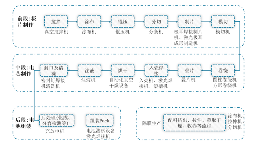 电芯组装工艺重要包括卷绕或叠片、电芯预封装、注电解液等工序,对精度、效率、一致性要求很高;电芯激活检测工艺主要包括电芯化成、分容检测等;