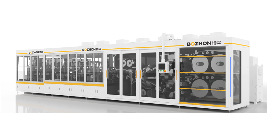 在切叠制程段,博众精工与蜂巢能源共同研发高速热复合切叠一体机,成功开辟行业新技术路线,设备可实现0.125S/pcs的超高效率生产极片,制程中有多套CCD监测设备,可保证每一片极片表面光滑无折痕,极片堆叠整齐无错位。不同于隔膜、正极片、负极片堆叠在一起的Z叠工艺,博众精工切叠设备首先通过两层隔膜包覆负极片经过加热辊进行热复合及隔膜封边,再裁切成片,最后和正极片依次堆叠,由此解决了长久以来传统叠片过程中可能面临的隔膜褶皱,极片掉粉、错位等难题。此外,设备同时集成叠片、热压功能,在减少设备占地面积、产线成本的同时,大幅度提升产线效率和产品品质,该设备于2023年实现大批量交付。