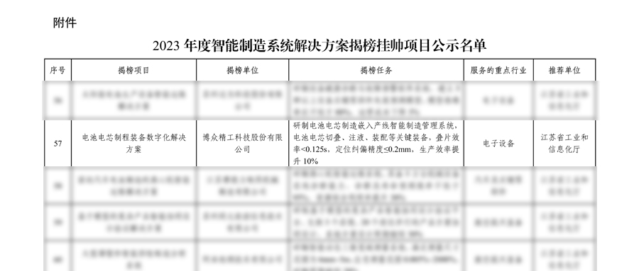 近日,博众精工“电池电芯制程中超官方网站数字化解决方案”成功入选工业和信息化部和市场监管总局公示的“2023年度智能制造系统解决方案揭榜挂帅项目”名单,成为江苏省8家上榜企业之一。