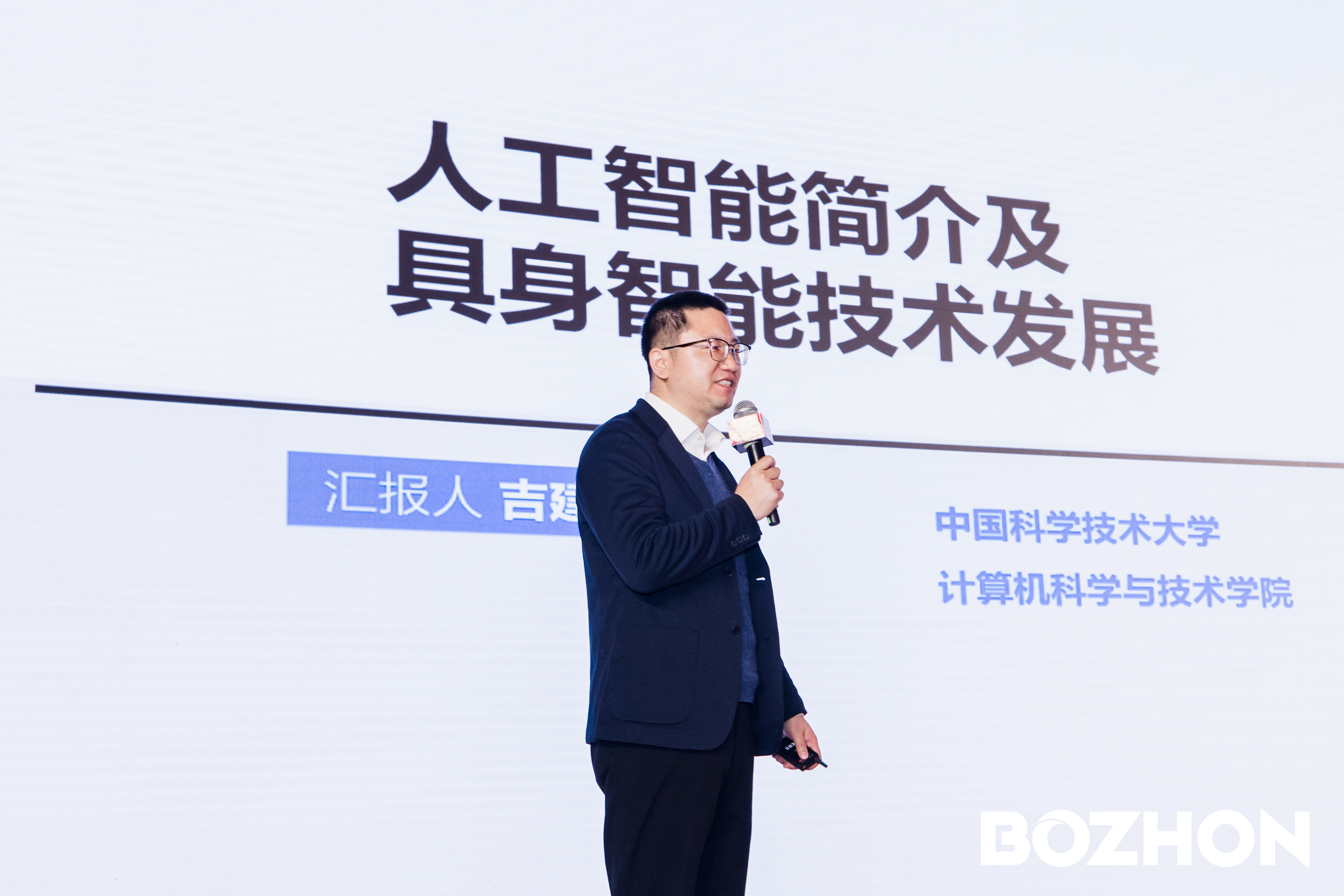 本次盛典特邀中国科学技术大学博士、香港科技大学博士后、中国科学技术大学计算机学院教授,认知机器人、自动驾驶、深度强化学习领域专家吉建民教授,为大家带来主题演讲《人工智能简介及具身智能技术发展》。吉教授与大家分享了其团队在机器人、自动驾驶、路侧感知等领域所积累的丰富背景与经验,深入浅出地介绍了人工智能、机器学习和深度学习。同时,吉教授还详细分析了具身智能的内涵和未来发展趋势,为我们展现了未来技术革新的无限可能。