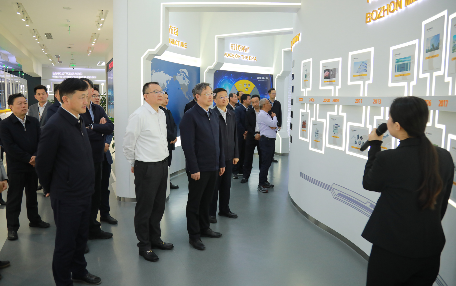 4月11日,江苏省人大常委会副主任周广智,苏州市委常委、市纪委书记、市监委代主任朱永安,苏州市人大常委会副主任黄靖,吴江区委书记李铭等领导一行,莅临博众精工参观指导,博众精工董事长吕绍林接待并陪同。