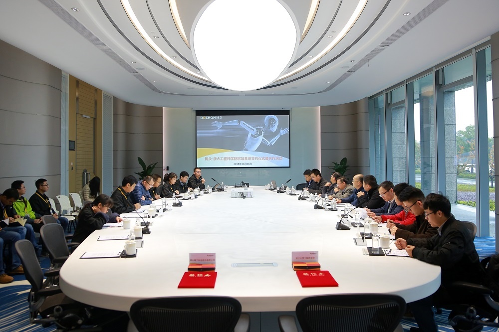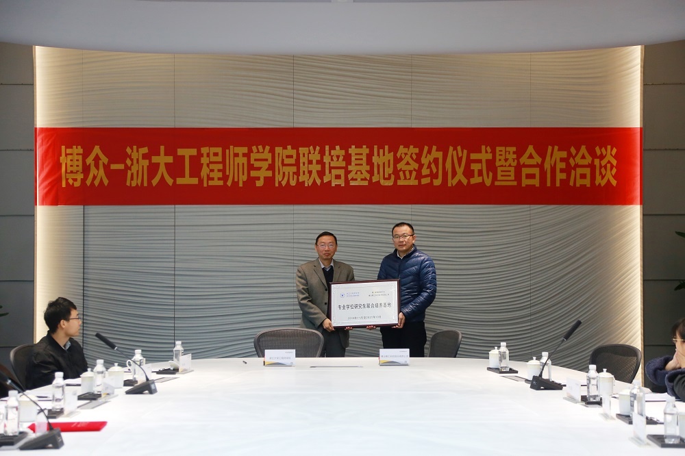 在介绍完学院及企业简介之后,双方正式进行博众—浙大工程师学院联培基地签约仪式和授牌仪式,并合影留念。签约仪式结束以后,联合培养研究生交流座谈及技术交流与科研项目合作洽谈继续展开进行。